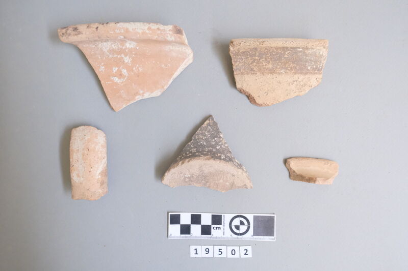 Sherds of a bridge-spouted jar with dark-on-light decoration (bands).