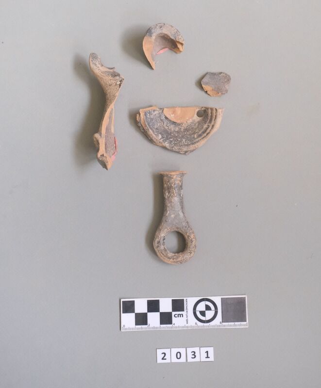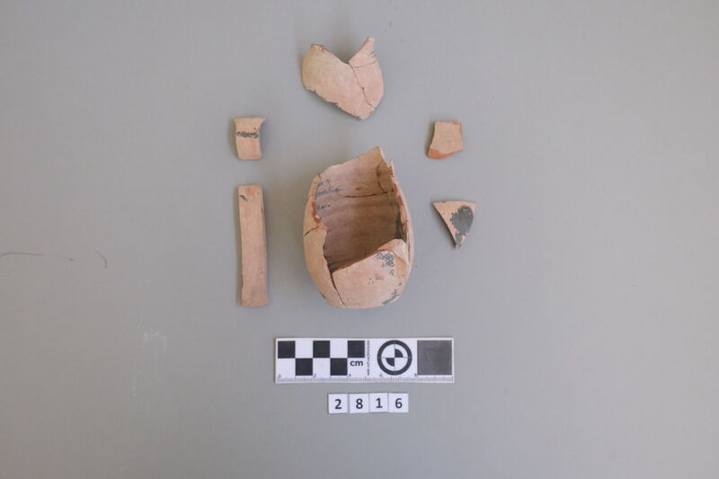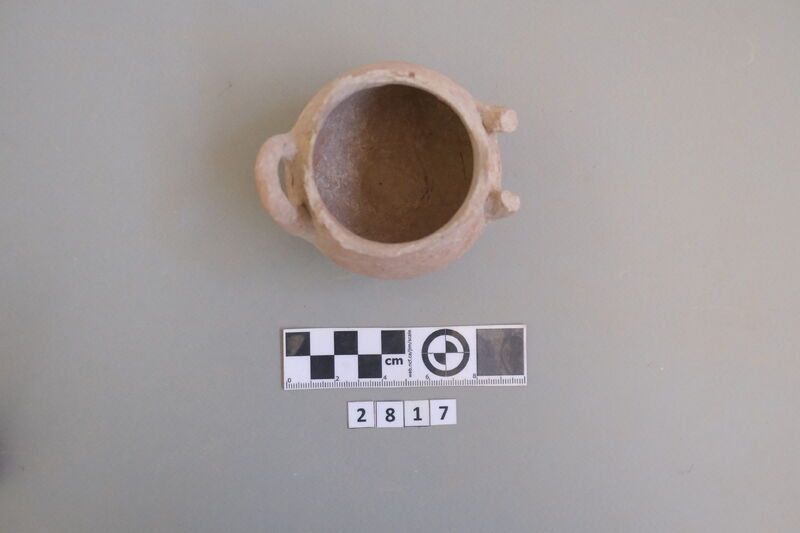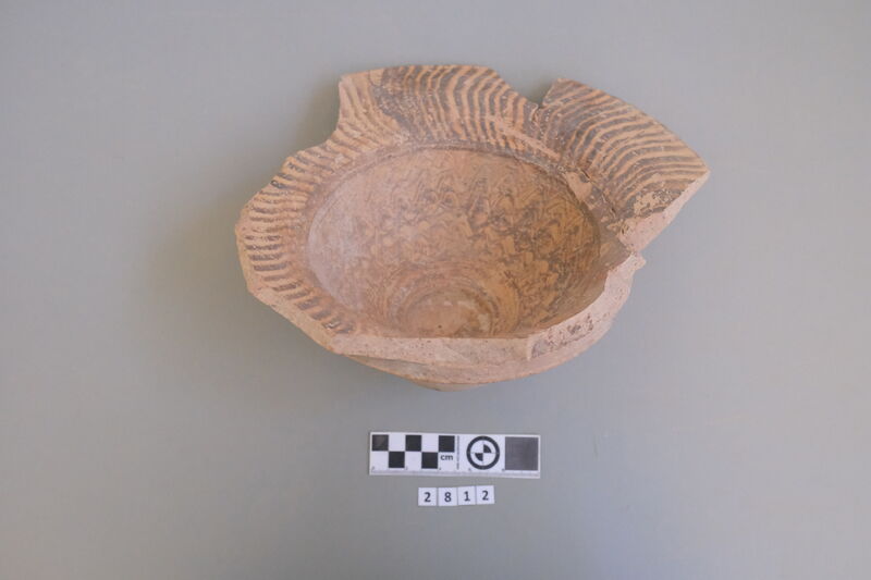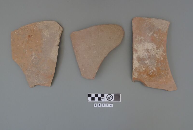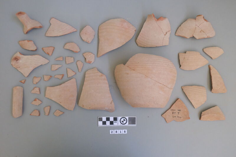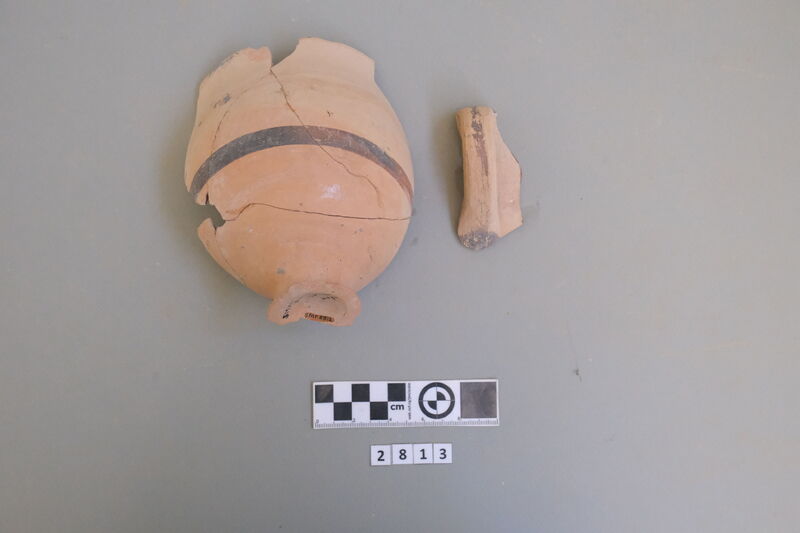 Recomposed coheel-ridged jug with flattened handle from shoulder to neck. Some neck and all rim are missing. Also gaps in wall.