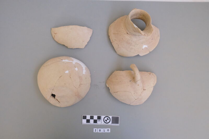 Olpe in three recomposed joining pieces with complete profile through handle but small gaps in wall