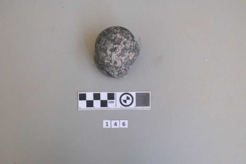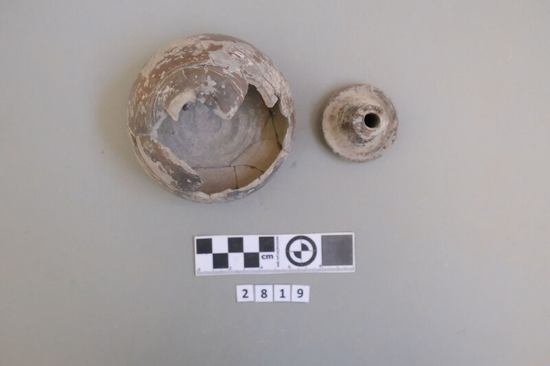 Lekithos in grey-brown glaze flaking. Two joining pieces ; body with low carination and tall ridged neck with conical mouth. A third of upper body missing.