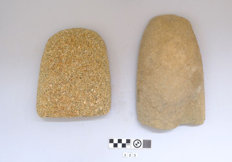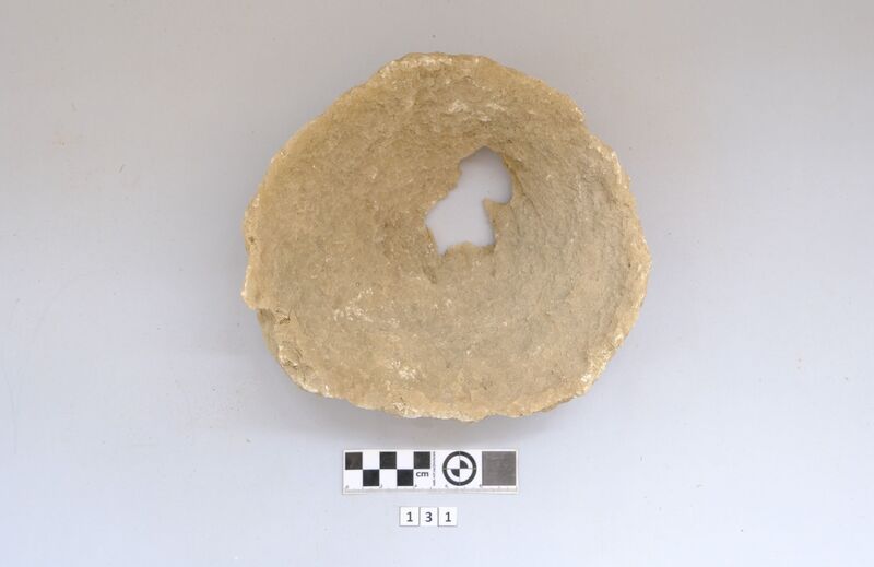 Stone grinding tools including querns and grind stones. One quern fragment with chipping indicating possible use as a tool.