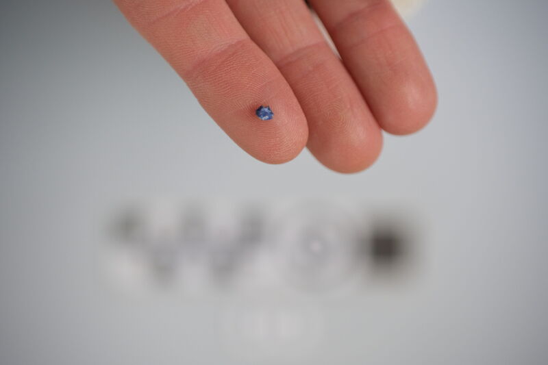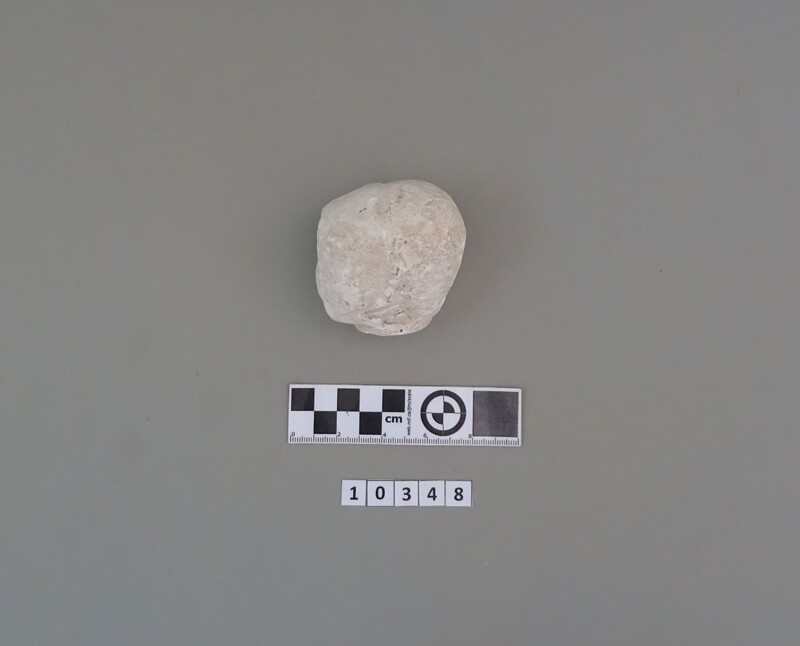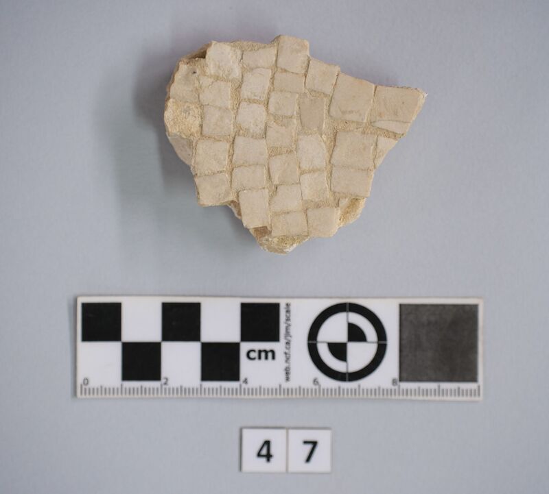 Fragment of mosaic. Upper surface with mosaic tesserae made of stone (marble?). Lower part with mortar visible.