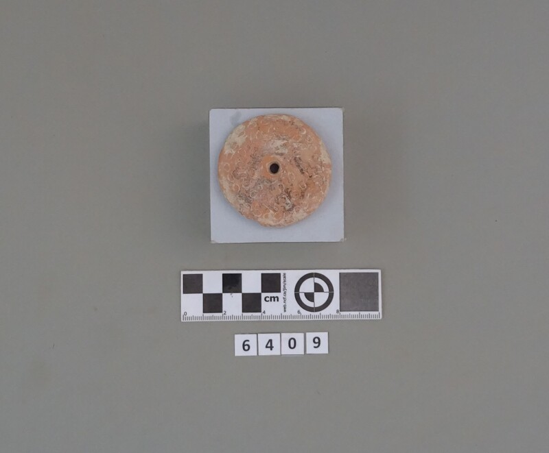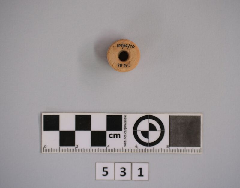 One complete cylindrical perforated clay object (spindle-whorl?).