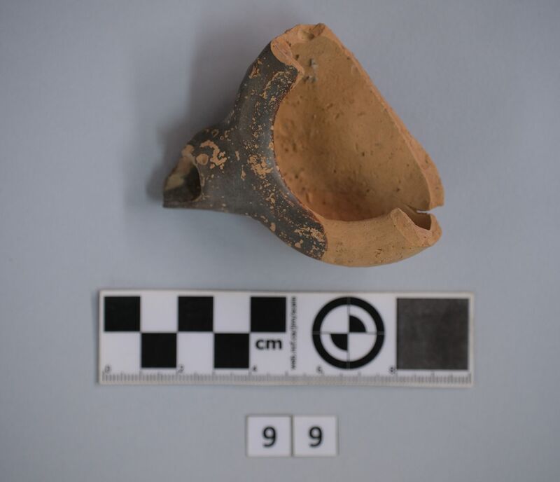 Fragmentary lamp. About half preserved. Dipped in brown paint around the nozzle.
