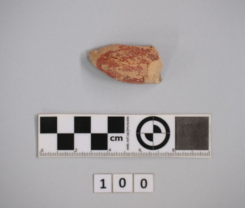 Fragment of rim of lamp and root of nozzle. Thick red slip. Burnt at core.