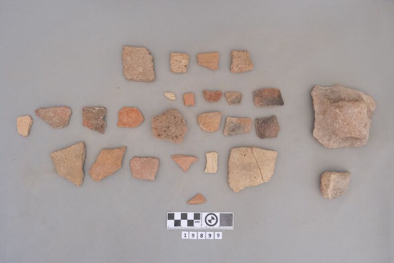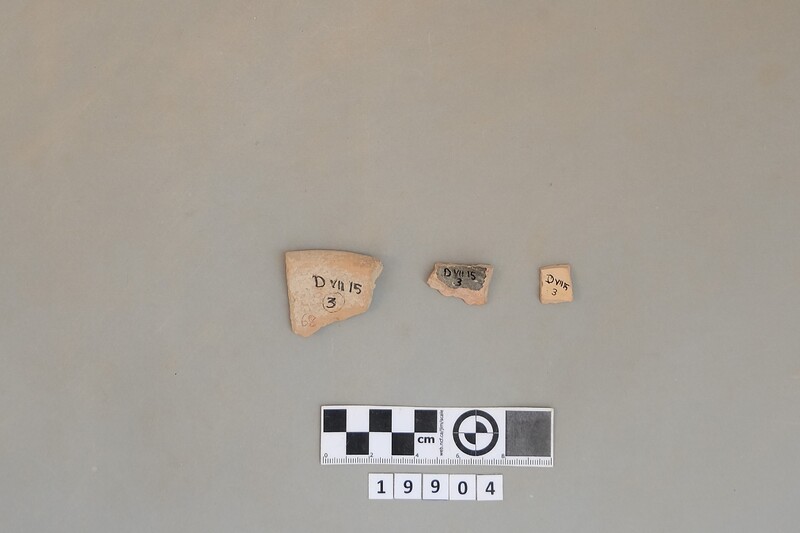 Fragments of Neolithic bowls and jars. Also one handle of pan or brazier.