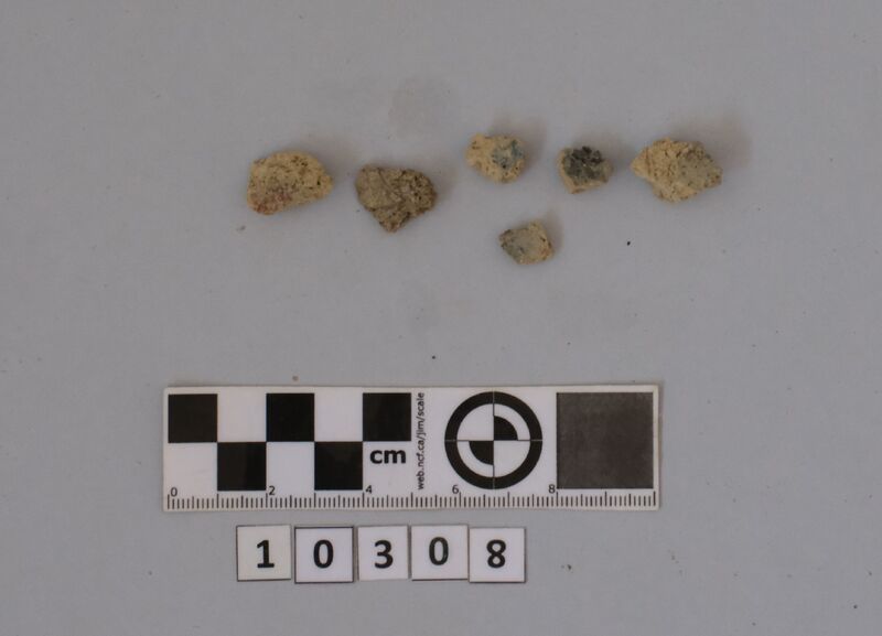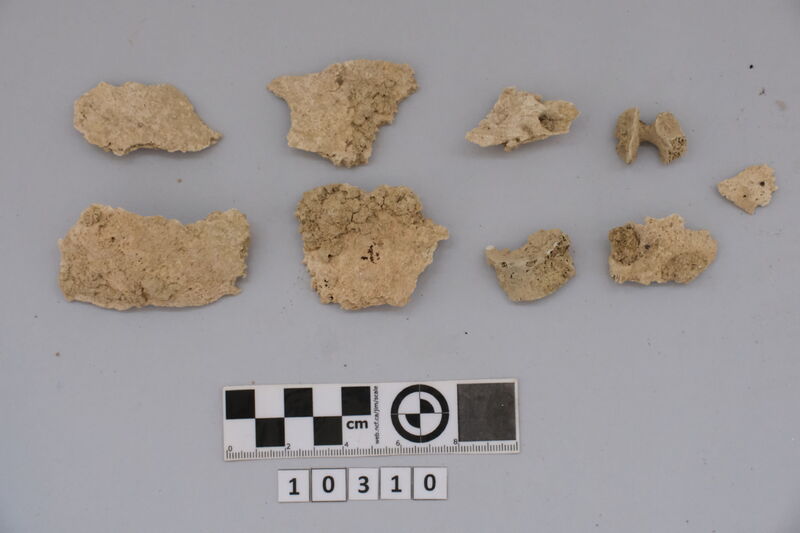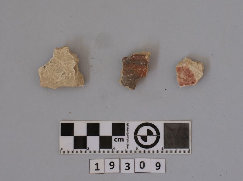 Several fragments of wall-painting with traces of blue and red painting. Two of them are big and covered with a thin layer (restoration ?). Also 8 fragments of human skull.