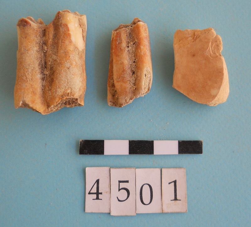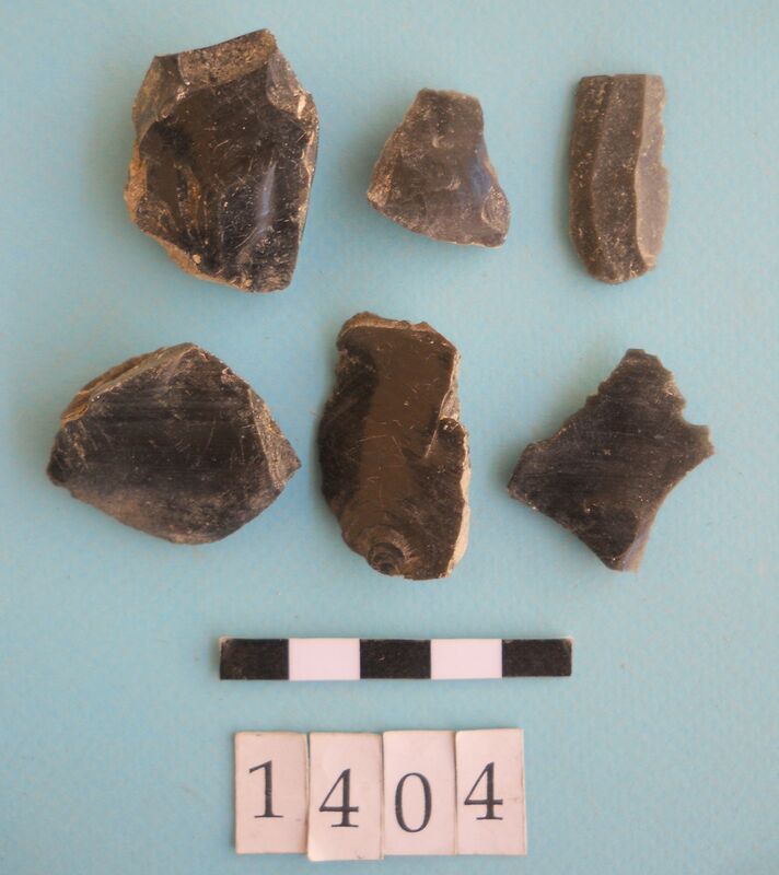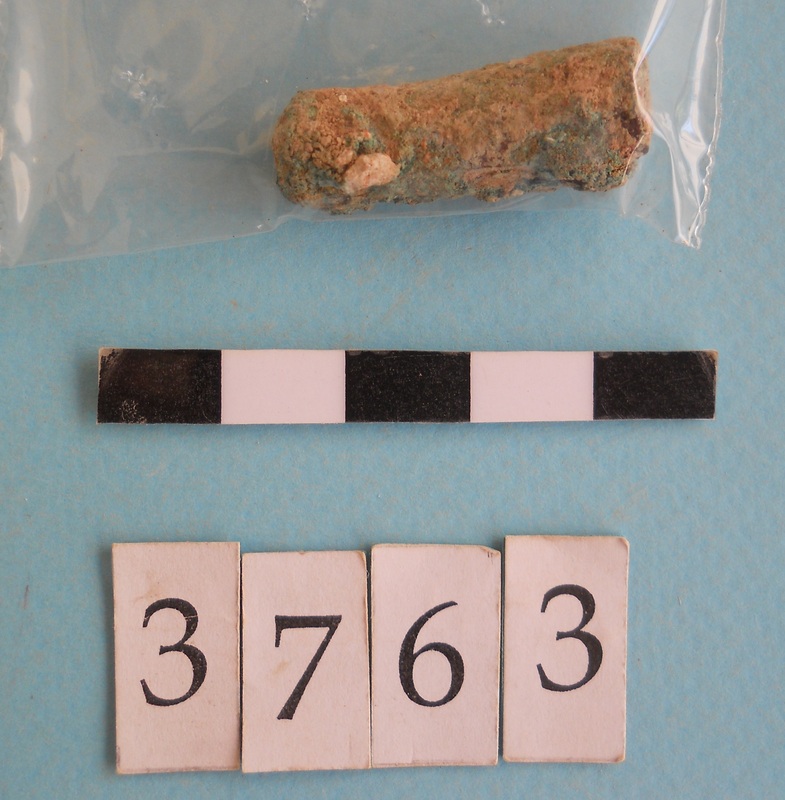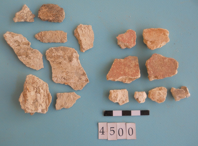 Fragments with red pigment and possibly modern concrete fragments too.