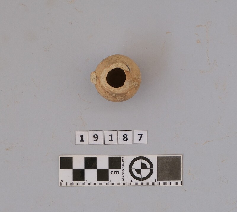 Almost completely preserved juglet. Neck missing. Start of a vertical handle. Piriform body. Monochrome painted on the outside.