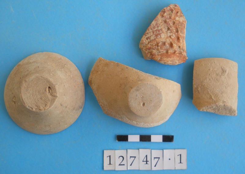 Three conical cups; profile. And one barbotine bodysherd.
