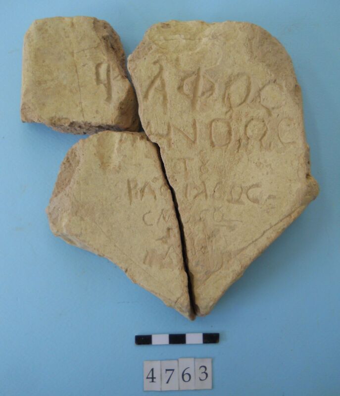 Three joining fragments with the written inscription: ΤΑΦΟC ΜΙΝΩΟC ΤΟΥ ΒΑΣΙΛΕΩC CNΩΣΟC (one side) AP (other side)