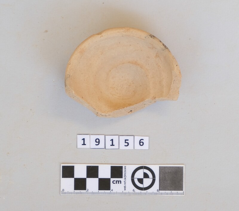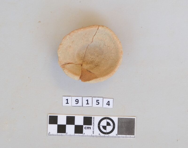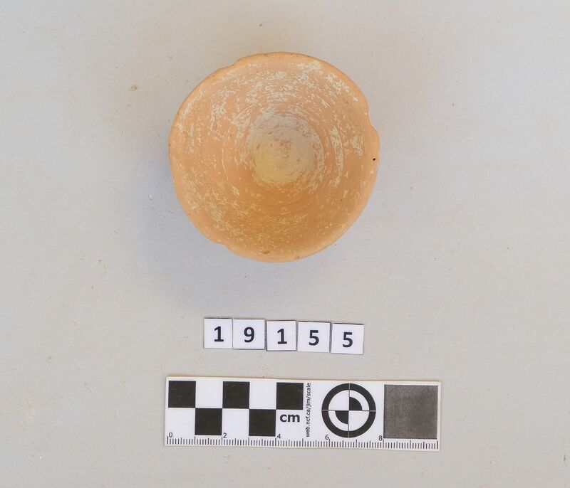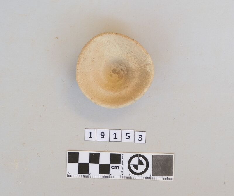 Almost complete and squat conical cup with flaring rim and soot deposit on the rim.